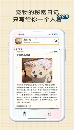 2. 日記生成系統:基于自然語言生成技術與情感計算模型,專屬萌寵每日自動生成手寫風格的暖心日記,細膩記錄與用戶的互動點滴。日記內容涵蓋清晨撒嬌、午后慵懶、夜晚陪伴等多樣化場景,系統通過情感語義分析捕捉用戶互動時的情緒波動,并將其轉化為寵物視角的溫暖文字,使每篇日記都充滿個性化治愈感,增強情感連接的深度與真實度。