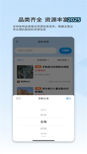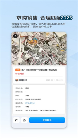 1. 智能供需匹配:基于深度學習推薦算法與地理位置服務,構建再生資源供需信息的精準匹配引擎。回收商可一鍵發布廢鋼、廢紙、廢塑料等品類信息,系統自動匹配半徑50公里內的潛在采購方,并通過智能推送通知促成交易對接。匹配算法綜合考慮品類規格、歷史交易信用與運輸成本等多維參數,使供需匹配效率較傳統方式提升約40%,大幅降低交易搜尋成本。