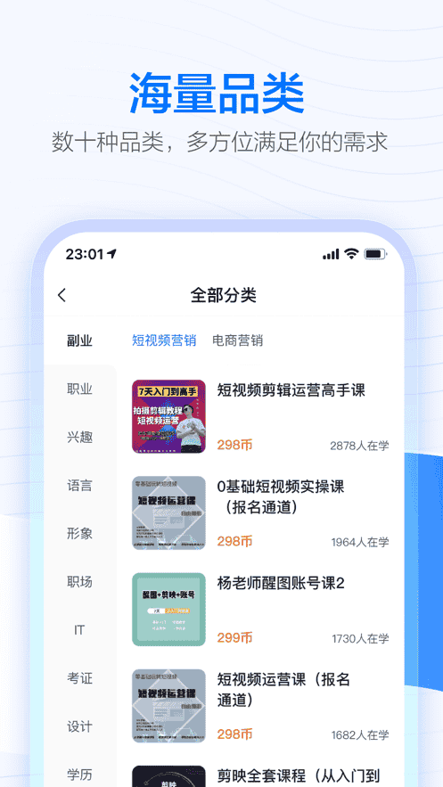 6、IT:編程語言、后端開發、測試運維、計算機通識課、前端開發、產品運營、認證考試。