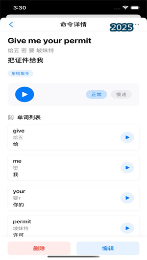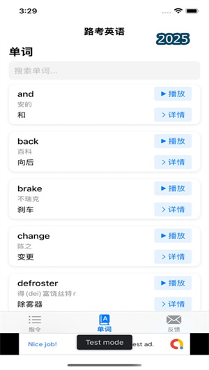 除了完整的句子指令,APP還提供專門的詞匯學習模塊。該模塊收錄了與駕駛考試密切相關的英語單詞和常用短語,并按照車檢詞匯、路考詞匯、交通標志詞匯等專題分類進行組織。每個單詞和短語都配有標準發音和中文釋義,部分關鍵詞匯還配有用法示例,幫助用戶在掌握指令的同時,夯實基礎詞匯量,全面提升駕駛場景下的英語應用能力。