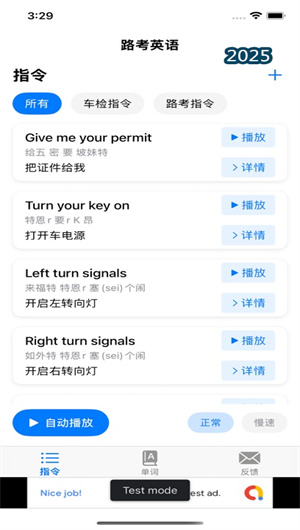 為優化學習效率,路考英文APP配備了自動播放功能,用戶可以設定連續播放模式,讓系統按順序或隨機朗讀指令庫中的內容。這種自動播放機制非常適合在碎片時間進行沉浸式學習,無形中強化了對指令的記憶鞏固。結合科學的間隔重復原理,系統會智能推送未熟練掌握的指令,確保練習記憶的效果最大化,使得用戶在通勤、家務等場景下也能高效備考,將時間利用率提升40%。