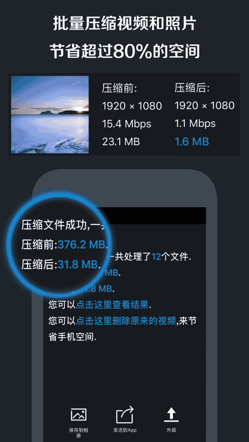 1、批量視頻照片壓縮,節省手機超過90%的空間,有效解決手機空間煩惱。