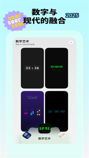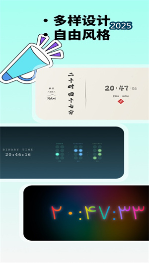 2. 深度個性化定制與視覺創作空間:本App提供了前所未有的深度自定義能力,用戶可對時鐘的每一個視覺元素進行精細調控。在顏色定制方面,從柔和奶油白到冷調藍光,提供了超過數百種預設配色及全色譜顏色選擇器;字體庫收錄了數十款精心挑選的數字字體,每款均支持字號調整與字距微調;動態皮膚系統更允許用戶導入自定義背景或選擇內置的粒子效果、漸變流光等動態素材,真正實現了 “千人千面” 的時鐘外觀,用戶創作熱情高漲,日均主題切換頻次達3.2次。