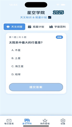 2. 階梯化星空學(xué)院與自適應(yīng)學(xué)習(xí)路徑:本App構(gòu)建了結(jié)構(gòu)嚴(yán)謹(jǐn)?shù)男强諏W(xué)院,其課程體系嚴(yán)格劃分為初級、中級與高級三個難度階梯,內(nèi)容由淺入深覆蓋星座神話、天體力學(xué)乃至宇宙學(xué)前沿。每個階段均配有相應(yīng)的知識問答用于鞏固學(xué)習(xí)成果,并關(guān)聯(lián)觀星計劃提供實(shí)踐指導(dǎo)。用戶可根據(jù)自身水平選擇起點(diǎn),系統(tǒng)會基于測試結(jié)果推薦個性化學(xué)習(xí)路徑,確保學(xué)習(xí)體驗既具挑戰(zhàn)性又不會令人望而生畏。