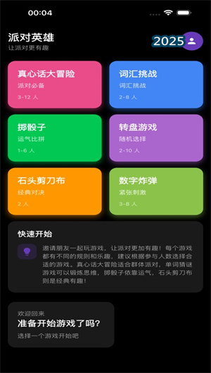 派對超人通過其豐富的游戲內容、智能的氣氛管理和極簡的交互設計,成功打造了一個全方位服務現代聚會的數字娛樂平臺。它不僅是聚會上隨手可用的游戲集合,更是深度理解社交需求、精準營造歡樂氛圍的智能伙伴。在派對超人的賦能下,每個普通人都能成為聚會中的氣氛掌控者,讓每一次相聚都充滿笑聲與回憶,真正實現"讓聚會熱起來"的核心承諾,重新定義數字時代的社交娛樂體驗。
