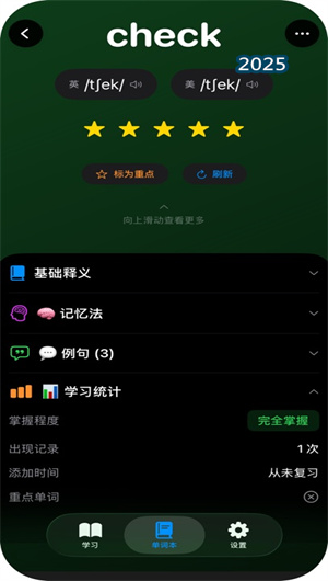 應用構建了一套精密的掌握度追蹤體系。每個單詞都引入了一個清晰的5星評級系統,用戶可根據熟悉程度進行標記。系統會記錄這些評級變化,形成每個單詞的掌握進度曲線。基于這些數據,智能篩選功能可以快速篩出“薄弱詞匯”或“已掌握單詞”,讓用戶的復習更具針對性。這種數據驅動的復習機制,確保了學習精力始終能投入到最需要的地方,實現了真正的個性化學習路徑。