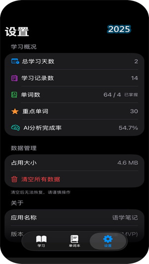 為了提供清晰的學習反饋,語學筆記配備了全面的學習數據統計儀表盤。它自動進行學習天數統計,以日歷等形式激勵用戶持續堅持;同時動態更新詞匯量追蹤數據,清晰展示總詞匯數與已掌握數量的對比。對于用戶標記的重點單詞,系統會單獨計算其掌握進度。此外,AI分析完成率這一獨特指標讓用戶對學習內容的智能化處理進度一目了然,確保了學習閉環的完整性與透明度。