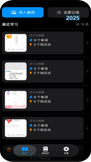語學筆記的核心入口是其強大的智能內容捕獲功能。用戶只需通過截圖導入或相冊導入學習內容截圖,應用內置的OCR文本識別引擎便會立即啟動,進行精準的文字區域定位與識別。隨后,AI智能分析模塊將對識別出的文本進行深度處理,執行智能提取詞匯操作,自動抓取出核心單詞、其精準釋義、標準音標及地道示例句子。這一自動化流水線徹底告別了手動輸入的繁瑣,將學習內容的錄入效率提升了70%,讓用戶能專注于學習本身而非筆記整理。
