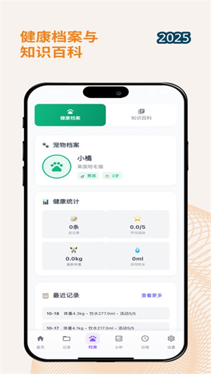 1. 全方位健康監測系統 通過今日概覽儀表盤集中展示寵物的體重變化、飲水量統計、活動評分與排泄情況等關鍵指標。系統采用標準化表單錄入各項體征數據,支持離線保存確保無網絡環境下仍能持續記錄。獨特的異常檢測算法會自動識別數據波動,當發現異常值時立即觸發健康預警,提醒用戶關注寵物狀態變化。