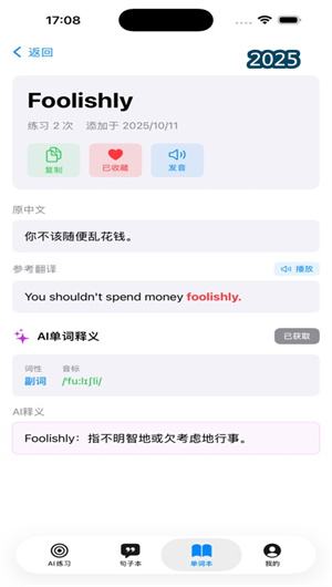 用戶可將學習過程中的實用口語句子收藏至個人句子本,建立專屬的口語素材庫。同時,應用提供智能的單詞本功能,自動提取學習過程中遇到的生詞難詞,并保留原句上下文,實現(xiàn)語境化記憶。系統(tǒng)根據(jù)遺忘曲線理論安排間隔復習,確保學習內(nèi)容得到有效鞏固,形成長期記憶。