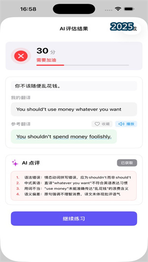除了基礎的錯誤糾正,應用提供全面的表現(xiàn)分析報告,從流利度、準確度、復雜度等多個維度評估用戶的口語水平。通過數(shù)據(jù)可視化圖表,用戶可以清晰看到自己在不同時間段的能力變化與進步軌跡。詳細的弱項分析幫助用戶識別需要重點改進的領域,使學習更加有針對性和效率。
