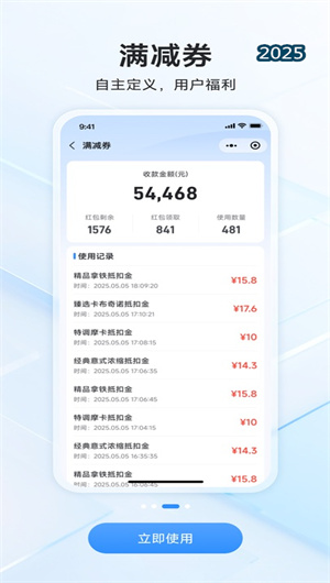琥珀商戶App內置了豐富的營銷工具,其中店鋪紅包與超值卡券是兩大引流利器。商戶可以通過營銷模板輕松創建店鋪紅包,自主定義紅包的使用門檻、有效期限和發放總量,以此作為新客的用戶福利或老客的回饋。同時,超值卡券系統支持創建代金券、折扣券、套餐券等多種形態,商戶可精準配置卡券規則,并通過多種渠道分發,直接拉動消費轉化。