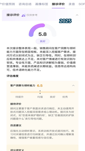 2. AI驅(qū)動(dòng)的接待行為診斷與技能優(yōu)化。此功能如同一位不知疲倦的服務(wù)質(zhì)檢專家,對(duì)每一次接待進(jìn)行多維度服務(wù)指標(biāo)的深度剖析。系統(tǒng)能夠基于預(yù)設(shè)的服務(wù)規(guī)范知識(shí)庫,智能診斷咨詢師的接待行為,精準(zhǔn)定位其在需求挖掘、項(xiàng)目闡述、異議處理等環(huán)節(jié)存在的服務(wù)短板。通過可視化的數(shù)據(jù)看板與服務(wù)轉(zhuǎn)化漏斗分析,管理者可以清晰地看到影響轉(zhuǎn)化技能的關(guān)鍵因素,從而為員工提供針對(duì)性的賦能培訓(xùn),實(shí)現(xiàn)從經(jīng)驗(yàn)指導(dǎo)到數(shù)據(jù)化決策的科學(xué)管理升級(jí),系統(tǒng)性提升團(tuán)隊(duì)的整體服務(wù)能力與成單率。