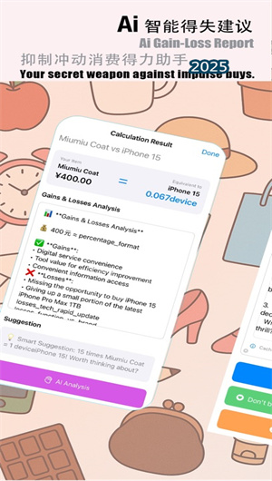 1. 得失計算器APP的AI得失分析報告系統采用自然語言處理技術,通過消費意圖理解引擎解析用戶輸入的購買物品信息。系統基于機會成本計算模型與價值替代分析算法,生成包含財務影響、情感價值與長期收益的多維度得失報告。該功能整合了消費情景模擬器與后悔概率預測模塊,將短暫的消費快感與具體的替代體驗進行量化比較,幫助用戶識別潛在消費陷阱,決策理性度提升約42%。