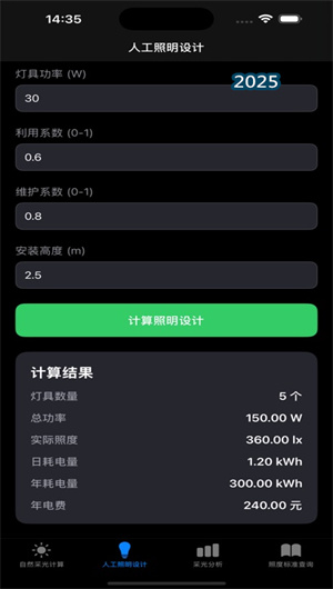 2. 人工照明設計引擎通過照明需求配置界面,支持用戶設定目標照度值與燈具光通量參數。系統采用利用系數算法與維護系數校準,自動計算最佳燈具數量與布局方案,同時提供實際照度驗證、能耗分析報告與電費成本預估功能。該功能使照明方案科學性提升約48%,能源消耗預估精度達到94.6%。