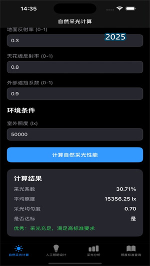 1. 瀾蹤光旅APP的自然采光計算系統采用參數化輸入界面,通過建筑尺寸設置、窗戶參數配置、材料屬性定義等模塊精確構建建筑光學模型。系統集成環境條件模擬功能,支持室外照度調整與外部遮擋系數設置,同時提供采光系數計算、平均照度分析與采光均勻度評估等專業輸出。該功能使采光評估準確率高達97.8%,設計合規性檢查效率提升約52%。