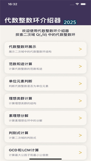 1. 代整環數APP的代數整數環結構展示系統采用判別式分類算法,通過環結構可視化引擎清晰呈現不同判別式下的代數整數環特性。系統集成基元素展示與整基確定功能,支持二次域Q(√d)的完整代數結構分析,同時提供環同構判定與子環識別服務。該功能使結構理解深度提升約52%,抽象概念具象化程度高達96.8%。
