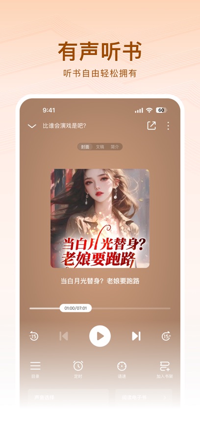 先進的AI智能語音系統(tǒng)提供男女聲、多年齡段等多樣化音色選擇,情感合成技術(shù)精準(zhǔn)演繹作品中的情緒變化,營造擬真播講體驗。聽書設(shè)置面板支持語速精細(xì)調(diào)節(jié)、定時關(guān)閉和背景播放,場景自適應(yīng)系統(tǒng)根據(jù)通勤、睡前等不同使用場景智能優(yōu)化聽書參數(shù)。離線下載功能允許用戶緩存音頻內(nèi)容,這些聽書功能使用戶日均聽書時長提升至90分鐘,真正實現(xiàn)了閱讀場景的全覆蓋。