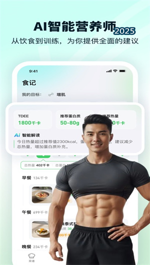 1. “飲食-訓練”雙環聯動智能指導系統:七分廚房App超越了單純的飲食記錄,特色在于其實現了 “飲食”與“訓練” 的智能聯動。在用戶的個人健康管家主頁,AI不僅提供飲食建議,還會基于用戶目標(如增肌需配合力量訓練,減脂需關注有氧運動與熱量缺口),給出相應的訓練建議重點。例如,對于增肌用戶,會強調蛋白質合成窗口期的營養補充與超量恢復原理;對于減脂用戶,則會結合其飲食記錄,評估碳水脂肪攝入的均衡性,并推薦合適的運動消耗方案,形成完整的健康管理閉環。