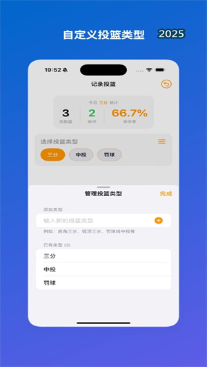 2. 個性化投籃類型管理:應用提供深度的自定義投籃類型配置功能,用戶不僅可以從預設的“三分球”、“中距離跳投”、“罰球”等基礎類型中選擇,更能創建完全個性化的投籃分類,例如“左側底角三分”、“弧頂接球跳投”、“后仰跳投”或“運球后撤步投籃”等。每個投籃類型可獨立設置訓練目標與權重,投籃分類管理系統支持層級化標簽,方便用戶對復雜訓練內容進行結構化歸檔。在數據統計時,系統會按類型進行獨立分析與交叉對比,幫助用戶精準定位特定投籃場景下的技術表現,實踐表明精細化分類訓練的用戶在薄弱環節的命中率提升速度比未分類用戶快42%。