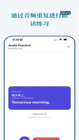 3. 主動式口語輸出訓練模塊:語言島APP強調從輸入到輸出的即時轉化,提供了多維度的主動口語訓練工具。核心的音頻跟讀功能,要求用戶緊隨母語者原聲進行影子跟讀,以訓練語音語調和口腔肌肉記憶。句子練習模式提供可自定義的停頓時長,讓用戶在提示音間隙進行回憶與復述。實時翻譯提示功能可在用戶卡頓時提供關鍵詞語義輔助,但不直接顯示全句,鼓勵主動回憶。所有跟讀錄音均可回放并與原聲進行對比,幫助用戶自我糾音,形成“聽-模仿-反饋”的閉環訓練。
