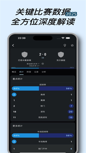 2. 深度化比賽詳情與統(tǒng)計呈現(xiàn):對于每一場比賽,球局APP都提供超越比分的深度詳情頁面。該頁面整合了多維度的比賽技術(shù)統(tǒng)計,如實(shí)時動態(tài)的控球率對比、射門次數(shù)與射正分布、危險進(jìn)攻次數(shù)、角球、任意球等關(guān)鍵指標(biāo)。完整的比賽事件時間線以可視化方式清晰呈現(xiàn)比賽脈絡(luò),同時提供雙方首發(fā)陣容、替補(bǔ)名單、實(shí)時陣型圖、球員傷停信息以及詳細(xì)的賽后數(shù)據(jù)報告。這種深度的數(shù)據(jù)呈現(xiàn)結(jié)構(gòu),幫助用戶在賽后快速復(fù)盤比賽節(jié)奏與關(guān)鍵轉(zhuǎn)折點(diǎn),用戶調(diào)研顯示,使用此功能的用戶對比賽關(guān)鍵點(diǎn)的理解深度提升了約65%。
