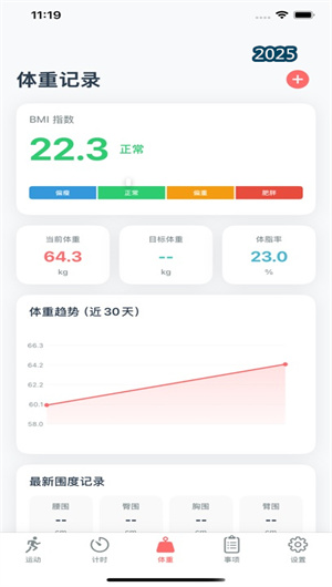 2. 多維健康數據追蹤與趨勢分析功能:應用提供專業的體重與體成分追蹤模塊。用戶可定期錄入體重、體脂率(若有兼容設備)等數據,系統會利用本地趨勢分析算法自動生成體重變化曲線,并計算周/月平均變化值。更重要的是,燃動紀獨創數據關聯洞察功能,能在本地嘗試分析運動頻率、強度與體重變化之間的潛在關聯,為用戶提供直觀的離線健康反饋。所有身體數據通過私密圖表可視化組件呈現,支持周視圖、月視圖切換,讓進步一目了然。