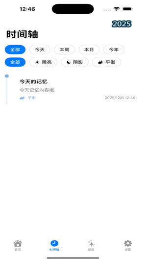 2. 多維記憶時間線可視化功能:應用提供了突破性的多維記憶時間線界面。不同于傳統的線性排列,光影時光通過時空網格渲染技術,將用戶的記憶節點依據時間、空間以及分析得出的“光影情緒值”在三維空間中定位。用戶可以通過動態縮放交互,從宏觀的人生年表視角,快速聚焦到某個特定的季節、地點或心境下的記憶集群。每條時間線都支持智能記憶摘要生成,系統能從特定時段中提取最具代表性的光影畫面與關鍵詞,幫助用戶快速把握不同生命階段的整體氛圍與情感基調。
