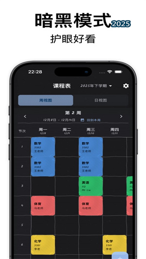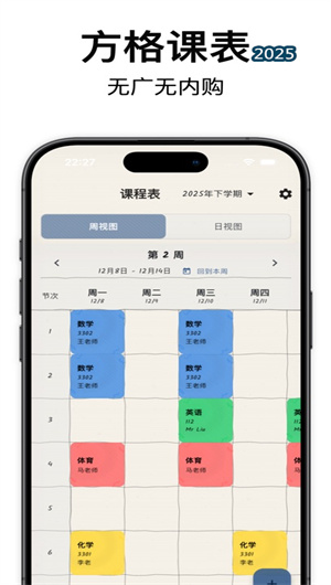 1. 智能雙視圖課程展示與導航功能:方格課表的核心是其高效的雙視圖展示系統。在周課表全景模式下,應用通過時間軸網格布局算法,將整周課程以清晰的時間區塊形式呈現在可視化周歷畫布上,讓用戶對課程分布、空檔時段一目了然,便于進行宏觀的學習計劃統籌。一鍵切換至日課表聚焦模式后,界面將轉化為以當日為核心的時間線詳細視圖,突出顯示每節課的具體名稱、地點、教師及用戶自定義的課程顏色標簽,確保上課關鍵信息無遺漏,實現從全局到細節的無縫銜接。