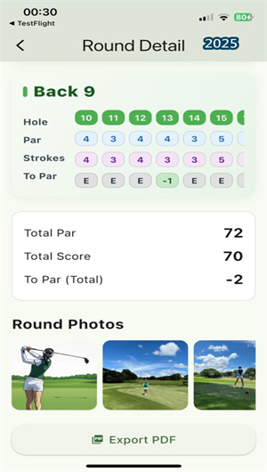 高爾夫日記App的標志性特色是其強大的PDF記分卡生成與導出功能。任一回合記錄完成后,用戶只需一鍵點擊“導出”,系統便會調用內置的專業排版引擎,將本回合的所有數據——包括球場信息、逐洞的標準桿與實際桿數、前后九統計、總桿數以及用戶可能添加的備注——自動編排成一份清晰美觀的PDF記分卡。該記分卡設計專業,堪比賽事官方記分卡,用戶可通過郵件、社交媒體等途徑輕松與朋友分享你的每一輪精彩表現或獨特經歷,分享功能使用率高達 65%。