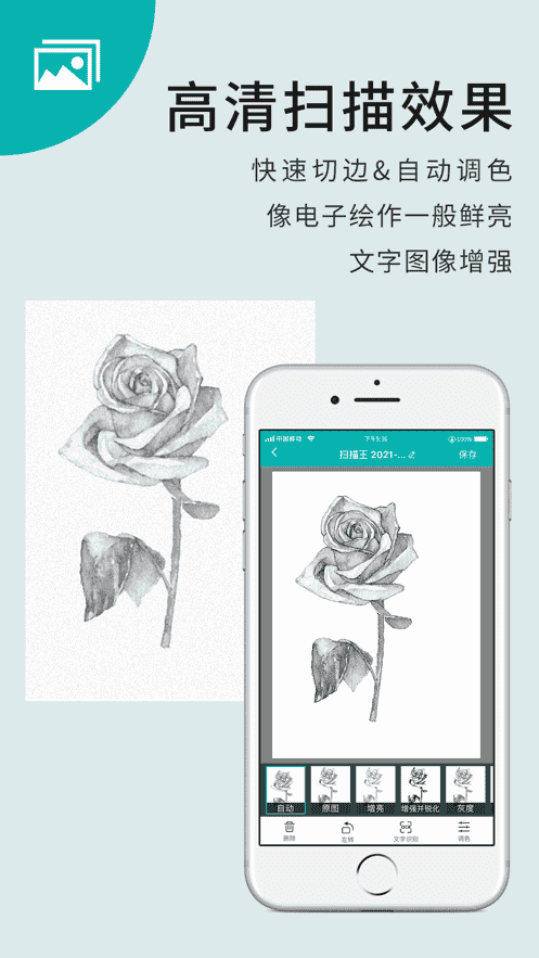 1、移動便攜式掃描儀,效果媲美上萬元的掃描儀器,快速切邊和自動調色,像電子繪作一般鮮亮,文字圖像增強效果明顯。