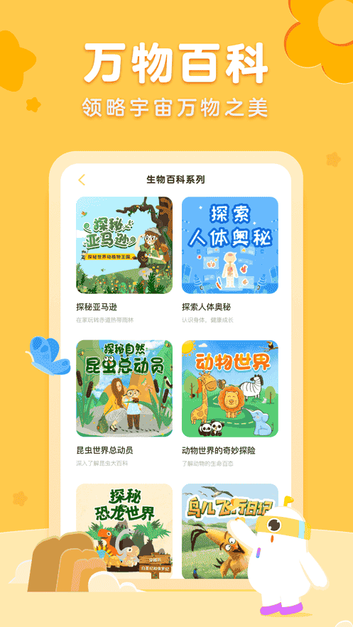 4、萬物百科全書領略宇宙萬物之美,如:《探秘亞馬遜》《探索人體奧秘》《昆蟲世界總動員》《動物世界的奇妙探險》《探秘恐龍世界》。