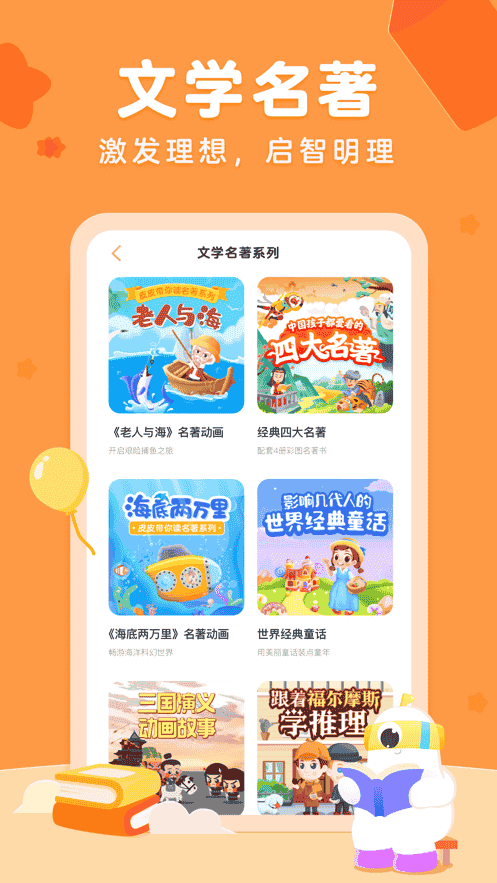 2、學習文學名著激發你的理想,啟明你的理智,如:《老人與海》《經典四大名著》《海底兩萬里》《三國演義動畫故事》《世界經典通話故事》。