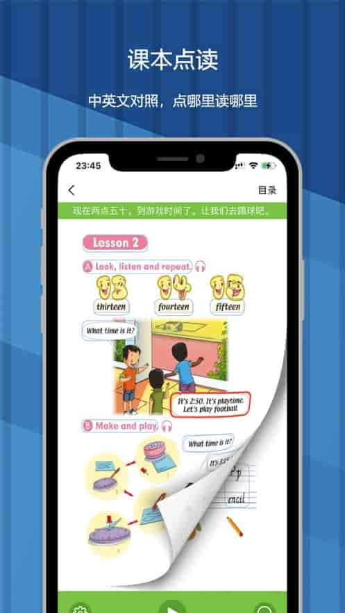 2、教材中的每一句話都配有標準的真人發音, 英漢對比, 即點即讀。