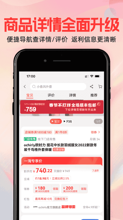 3、商品詳情全面升級,便捷導航查詳情、評價,返利信息更清晰。