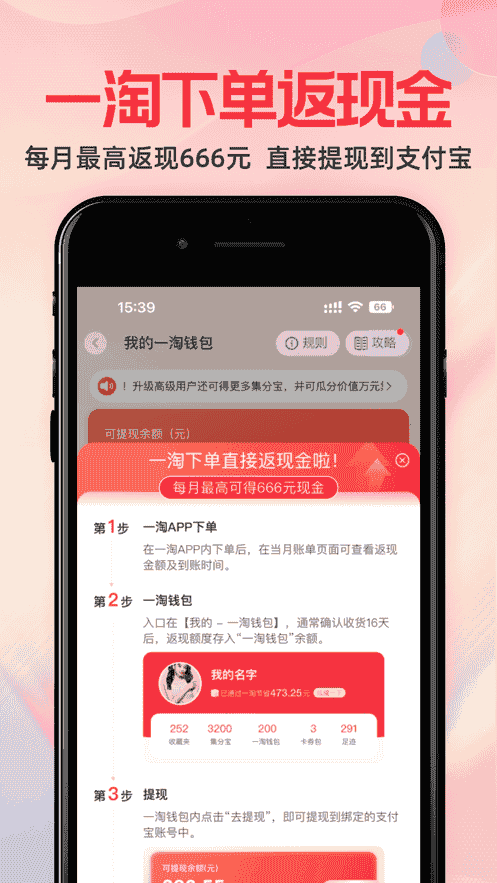 1、一淘下單返現(xiàn),每月最大返利666元,直接提現(xiàn)到支付寶。
