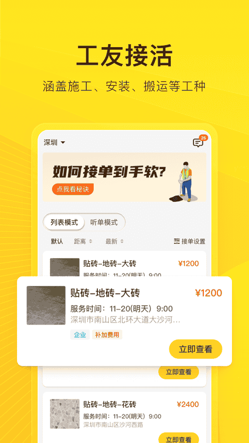 1、線上平臺(tái)施工找人速度快,工友師傅施工靠譜、施工工種類齊全,涵蓋施工、安裝、搬運(yùn)等工種。
