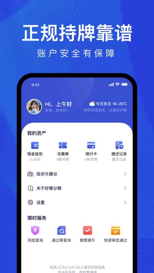 好借分期App,由德云晟小額貸款股份有限公司優(yōu)質的線上貸款產品,為借款人提供專業(yè)的貸款服務,解決您的應急借款需求!