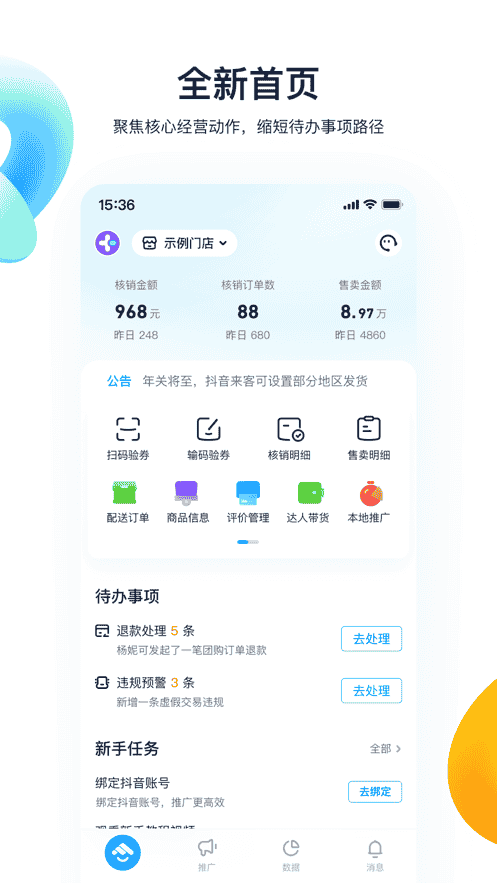 1、全新首頁聚焦核心經營動作,縮短待辦事項路徑,一站式助力商家推廣,幫助商家經營成長。