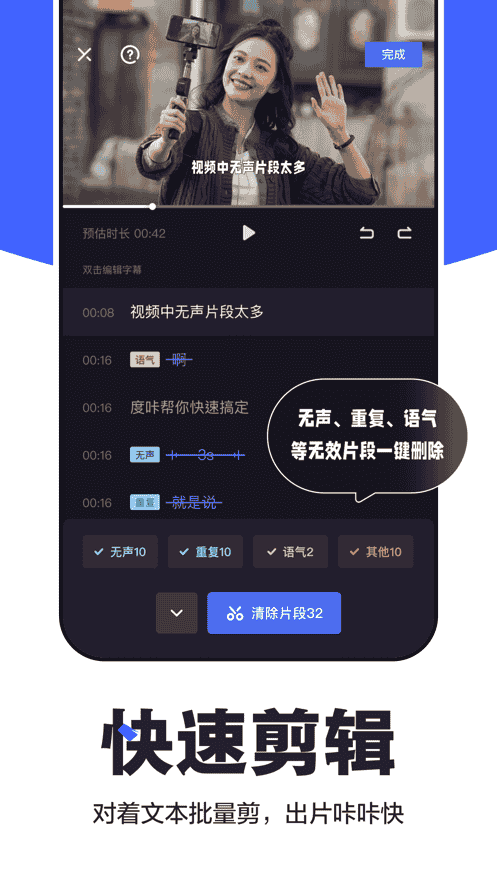 2、智能美顏提詞,無(wú)懼鏡頭,素人也能侃侃而談,快速剪輯,對(duì)著文本批量剪,出片咔咔快。