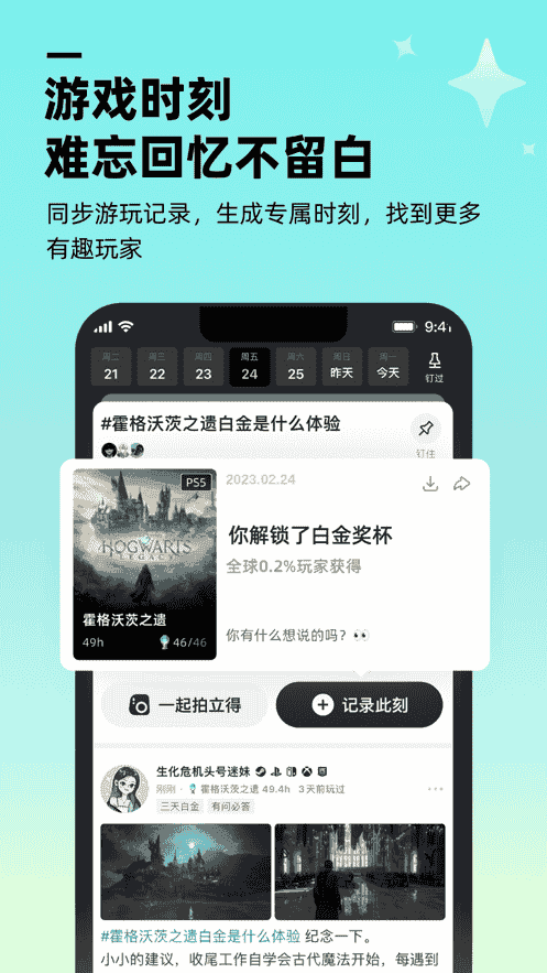 1、游戲時刻,難忘回憶不留白,同步游玩記錄,生成專屬時刻,找到更多有趣玩家。