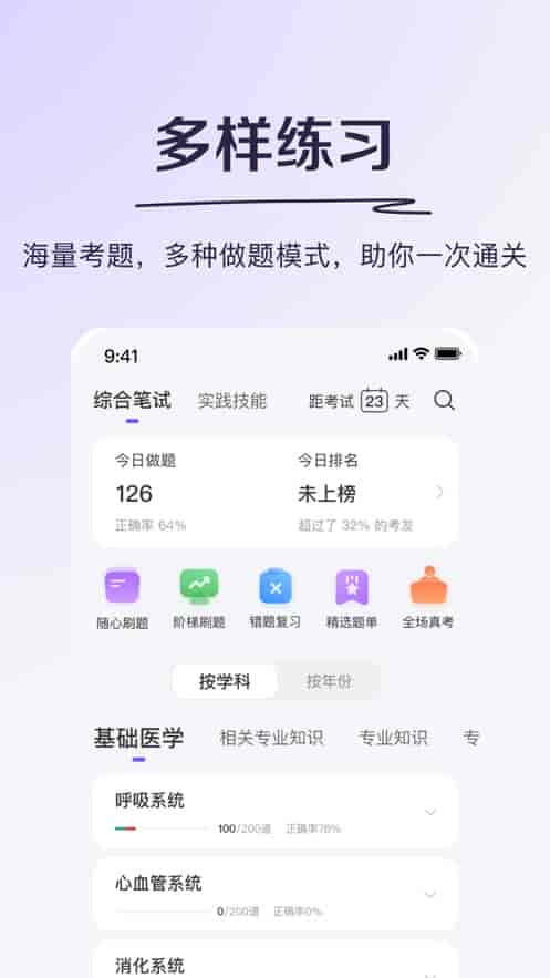 2、同步最新的醫學的官方教材講解,每章節的重點試題有視頻解析喲,每天打卡練習,刷 題便捷,醫學考試輕松過!