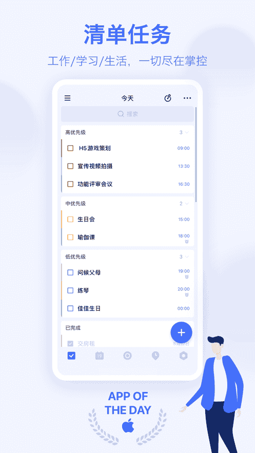 1、無論是工作學習還是生活日常,所有事項都可以定制清單任務,一切盡在手機掌控。