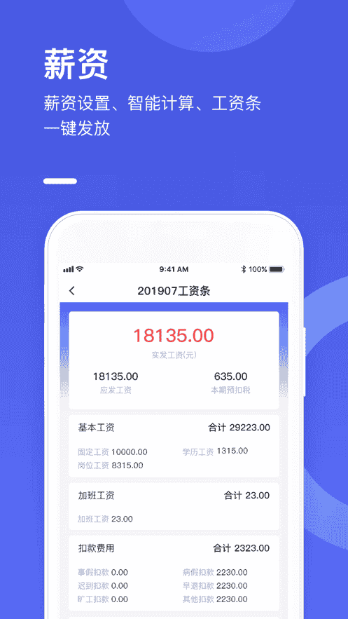 2、薪資設置、智能計算、工資條一鍵發放,結合考勤和請假管理及社保公積金,精確計算薪酬,實現0誤差。