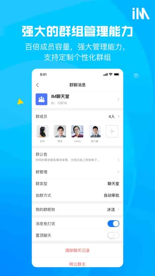 3、強大的群組管理能力,百倍成員容量,強大的管理能力,支持定制個性化群組。