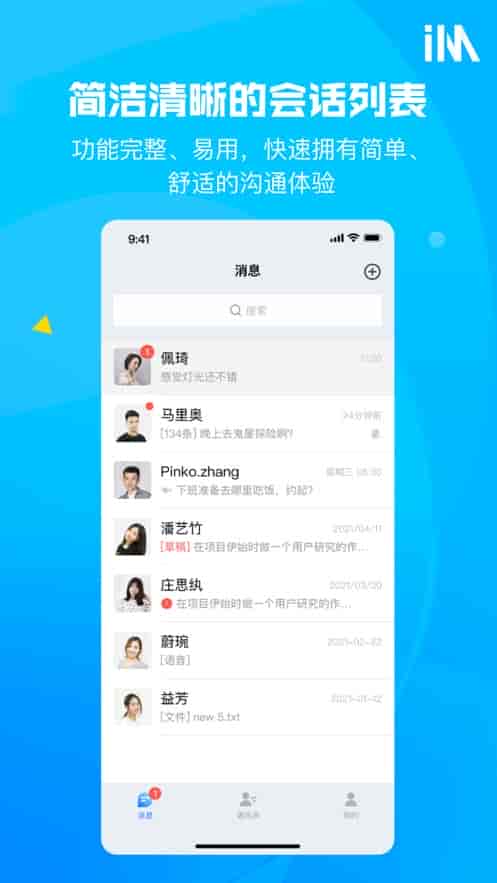 1、簡潔清晰地會話列表,功能完整易用,快速擁有簡單、舒適的溝通體驗。