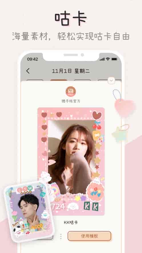 1、咕卡擁有海量素材,輕松實現咕卡自由。豐富模板,一鍵排版,電子手賬輕松玩。
