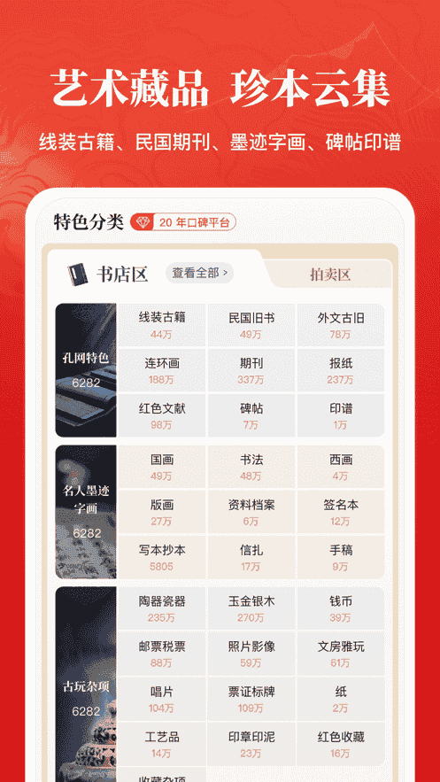 1、花少錢買好書,20年口碑平臺,5.0全新升級。藝術(shù)藏品,珍本云集,線裝古籍、民國期刊、墨跡字畫、碑帖印譜。