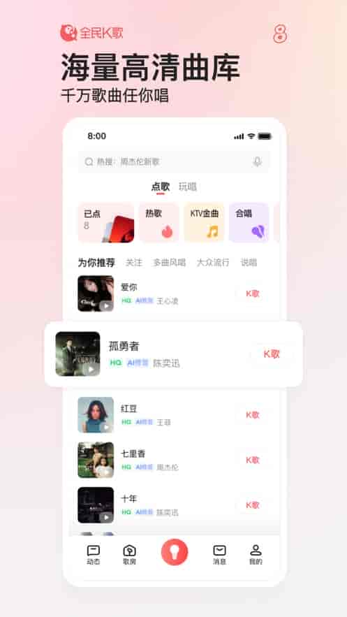 1、建立一個新的k歌社區,用聲音記錄你的生活。圖形和語音使分享更加生動。大量音樂滿足您的各種風格。強大的聲音效果和一鍵修復功能給您錄音室般的k歌!