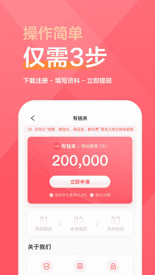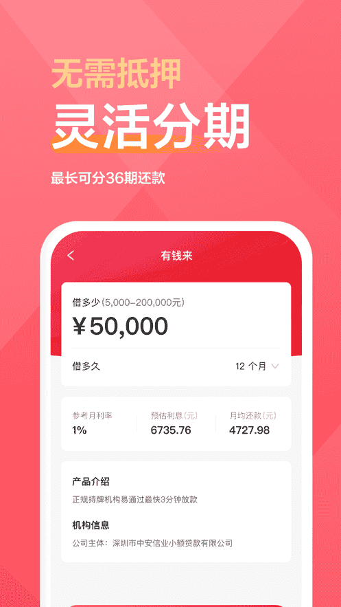 有錢來App是一款由深圳市中安信業小額貸款有限公司打造的極速分期貸款借錢平臺,該應用程序旨在為用戶提供快速、簡便的貸款服務,以滿足他們在緊急情況下的資金需求。